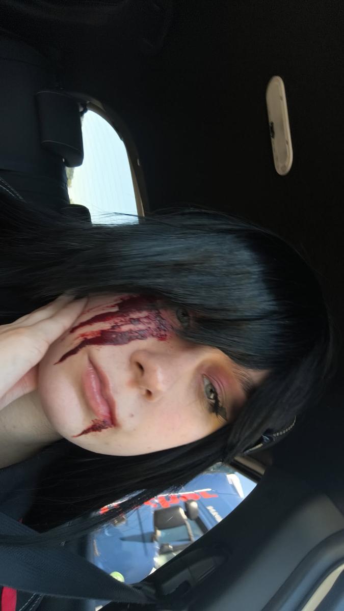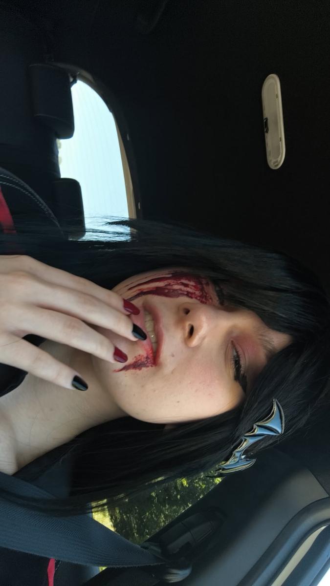 Sie hat lange zerzauste schwarze Haare, Hälfte ihres Gesichtes ist verdeckt. Sie versteckt eine Wunde, trotz Wunde Kämpf die tapfere Kriegerin weiter. Da sie nicht menschlich ist, aber das hält sie nicht auf so mysteriös unter den Menschen zu leben. In ihrer Rot schwarzen Uniform merkt man es ihr auch nicht an, das sie anders ist als andere.